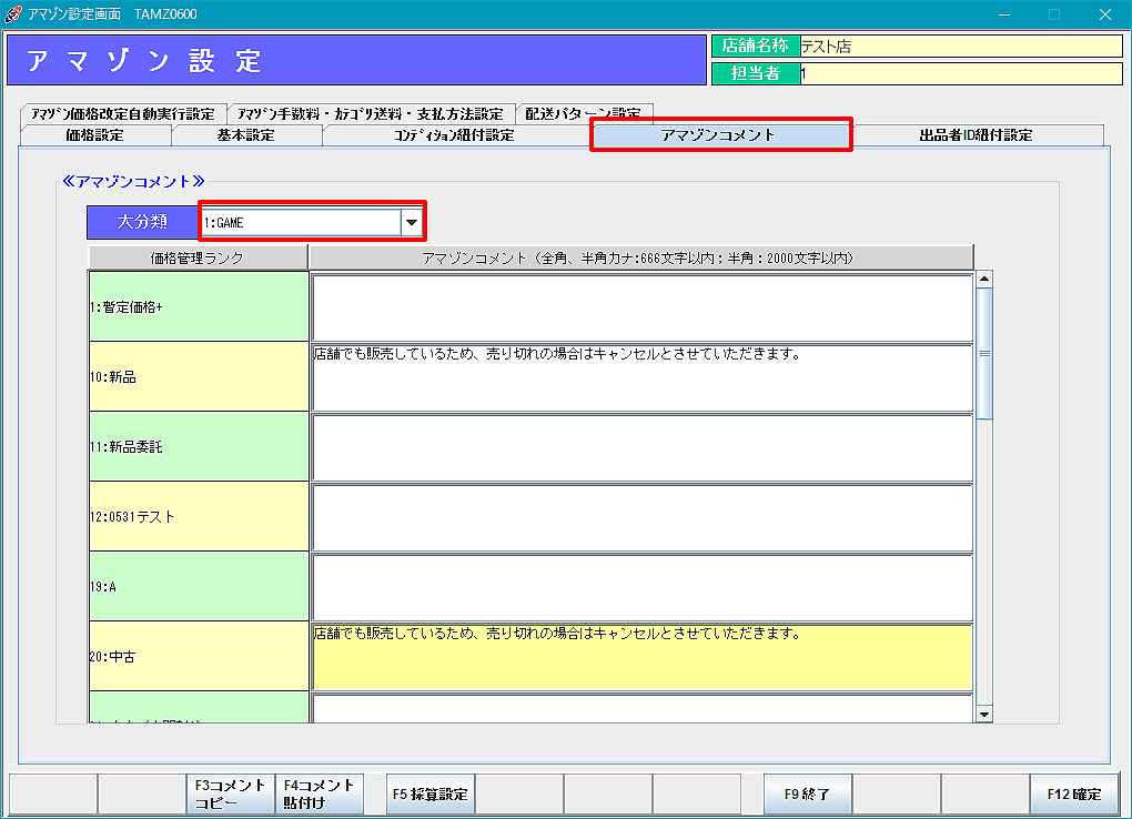 アマゾンコメント:大分類ごとにタロスの価格管理ランクに対するアマゾンコメントを設定します。