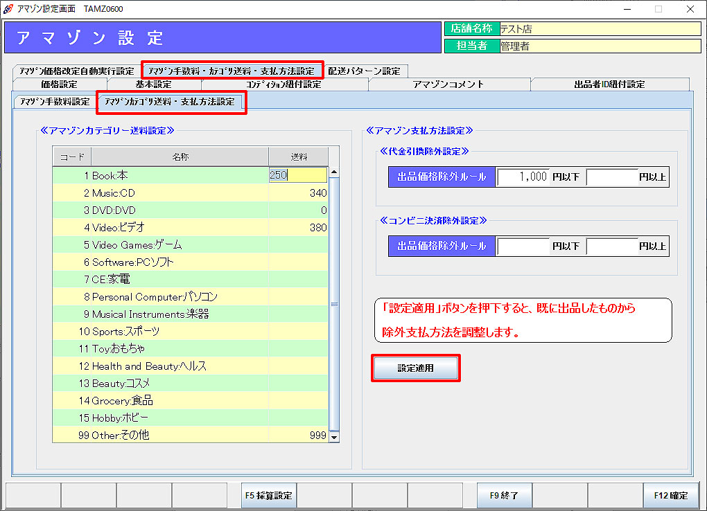 アマゾン手数料・カテゴリ送料・支払方法設定、配送パターン設定を行います。