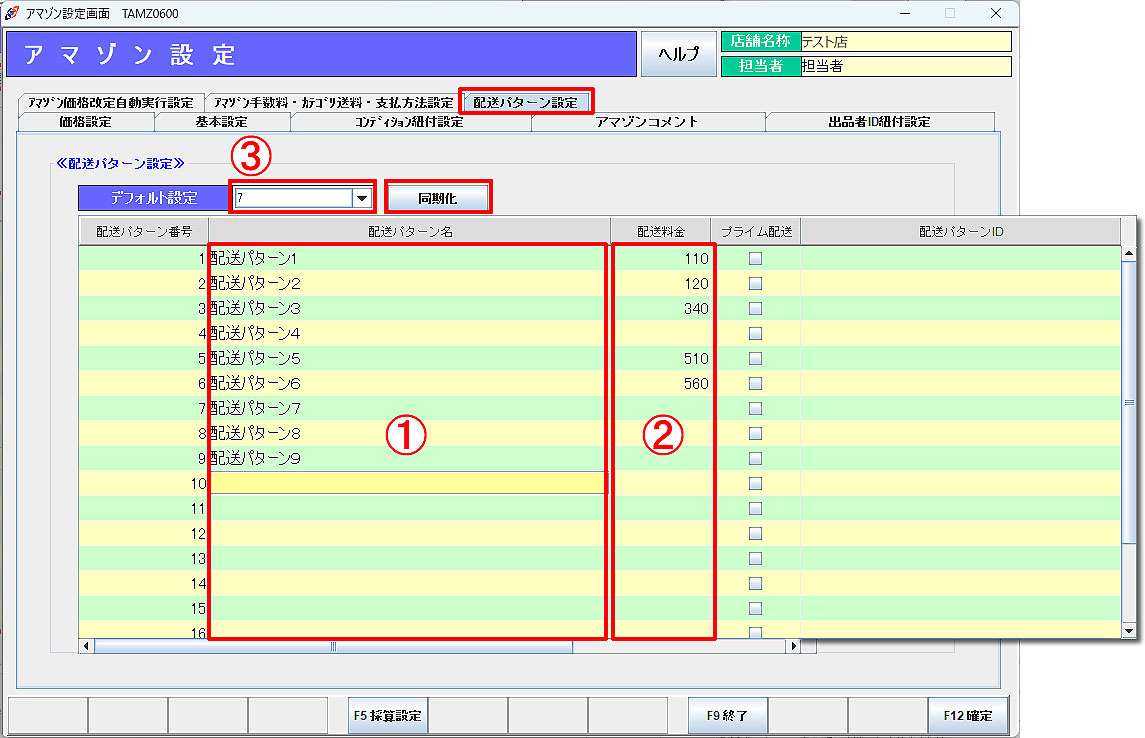 ※ 「同期化」ボタンを押すと、アマゾン側から配送パターン設定(配送パターン名称、配送パターンID)を取得できます。手入力の必要はございません。