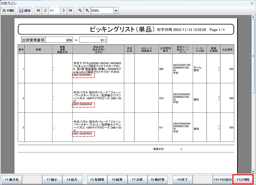 ※ 条件の「注文ID出力区分」を「出力する」にすると、ピッキングリストの商品名称欄に「注文ID」が表示されます。