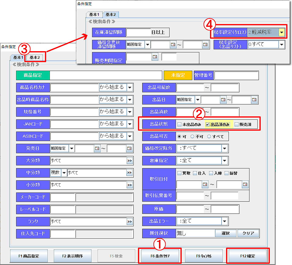 ① 出品条件指定画面で「F6条件クリア」をクリックします。