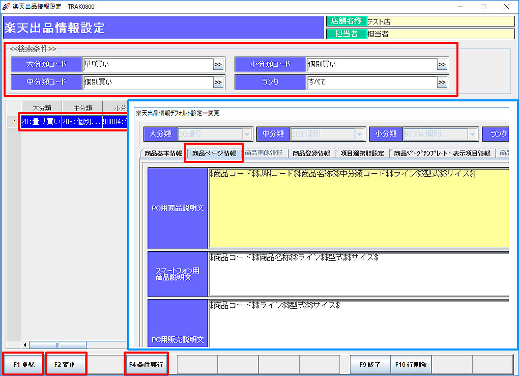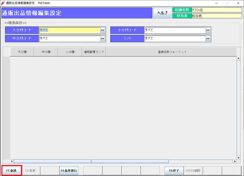 「F1登録」より新規登録、若しくは出品登録時に保存した情報を呼び出し、「F2変更」で編集します。