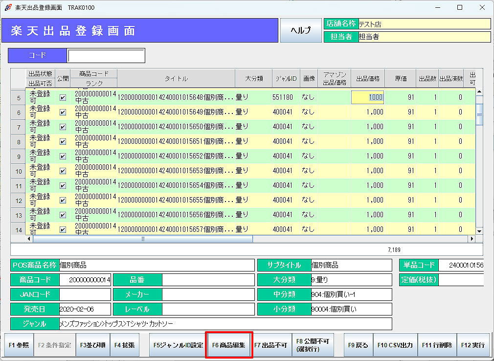 出品登録商品を呼び出し、「F6商品編集」より商品タイトル・コメントの編集を行います。