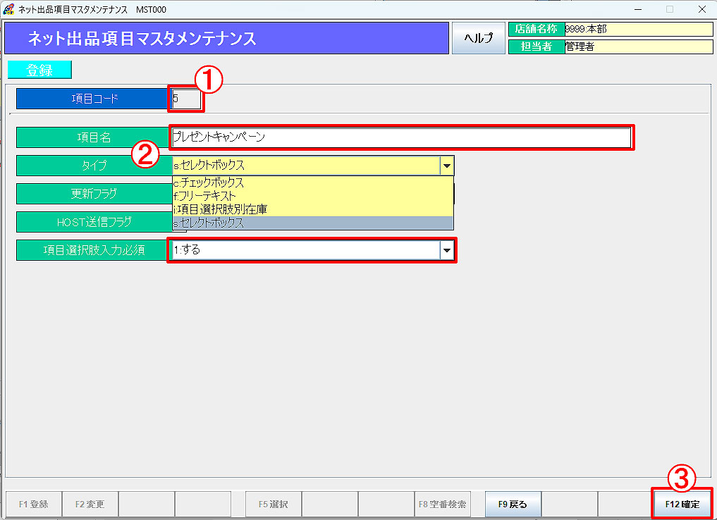 ③ 「F12確定」をクリックすると、「新規登録します。よろしいですか?」と表示されます。 「F12はい」で設定を完了します。