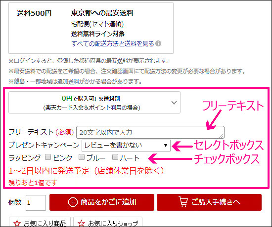 在庫設定はできませんが、注文ボタンの上にプルダウン式(セレクトボックス)のメニューや、チェック式(チェックボックス)のメニュー、フリーテキスト式のメニューを作ることができます。 1商品に対して複数のメニューを設定することが可能です。