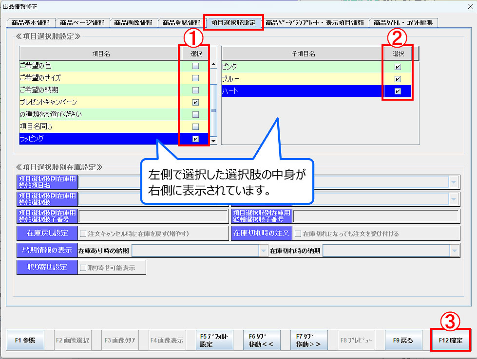 ① 出品商品に対してユーザーに選択してほしい項目にチェックを入れます。複数選択が可能です。