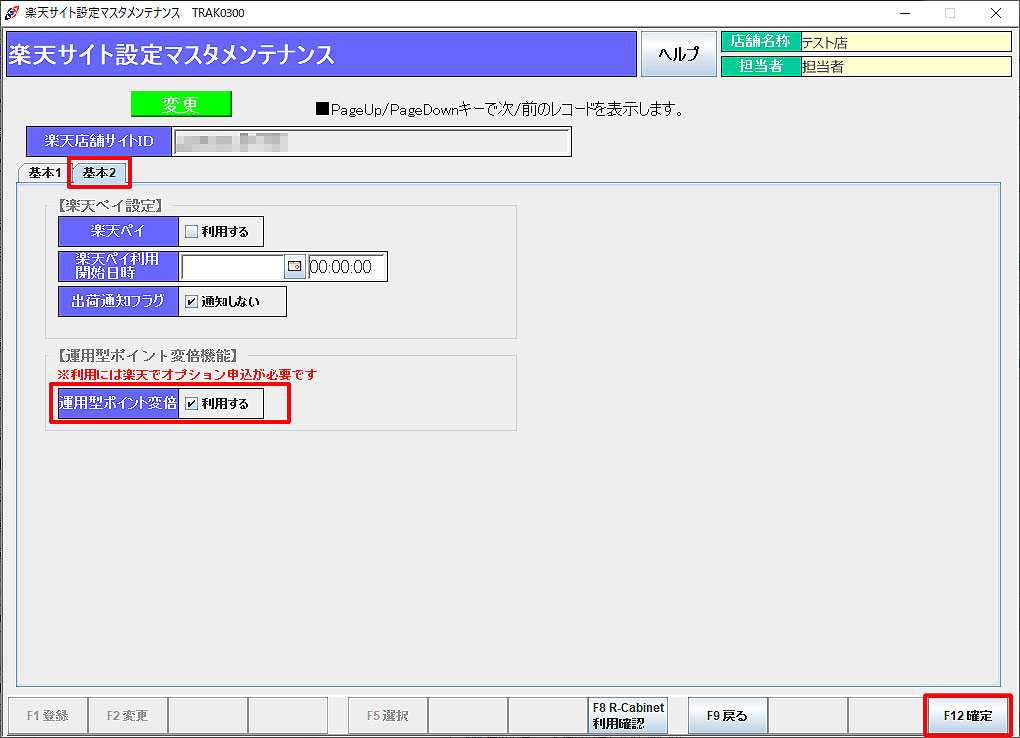 ① 楽天店舗サイトID:ご契約時に取得したID(下記参照)を入力します。