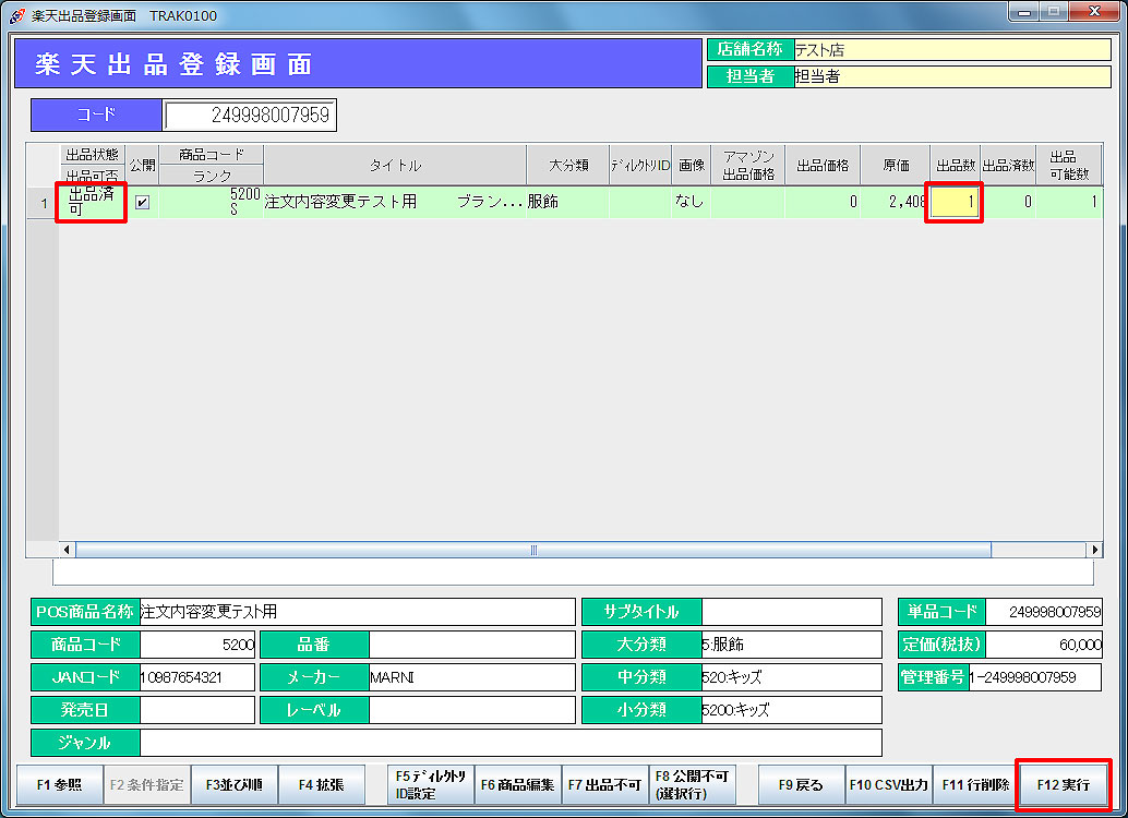 出品状態が「出品済」、出品数に「1」が入っていることを確認し、「F12実行」をクリックします。