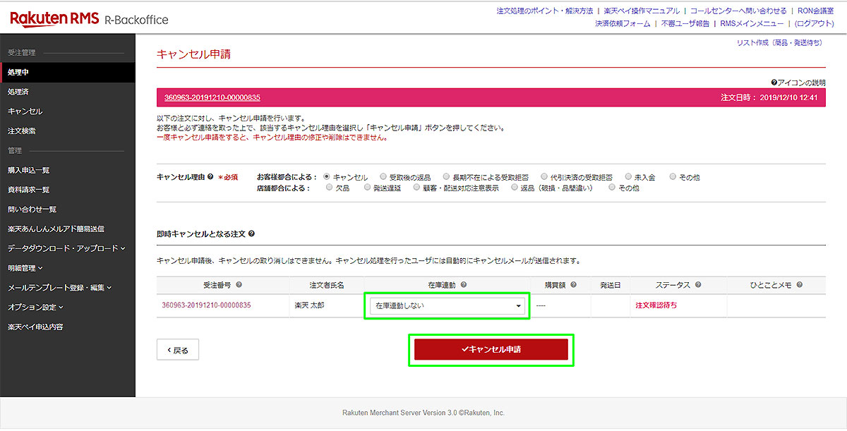 4.続いて楽天RMSでキャンセル処理を行います。