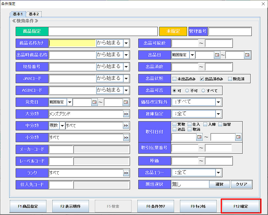 検索条件を入力し、「F12確定」をクリックします。