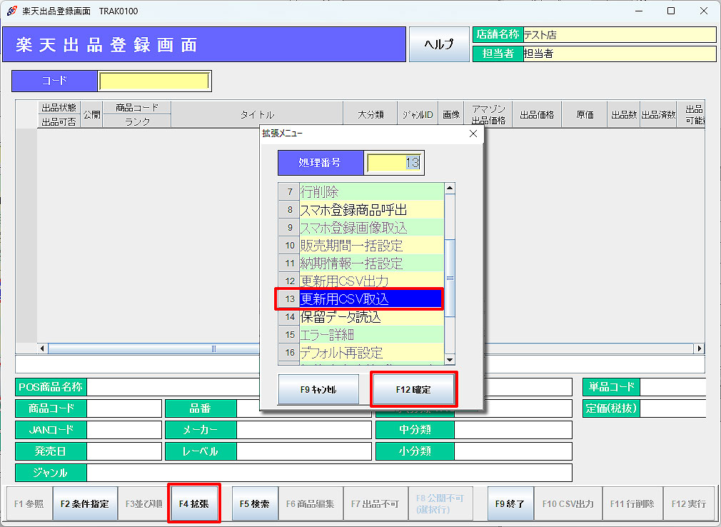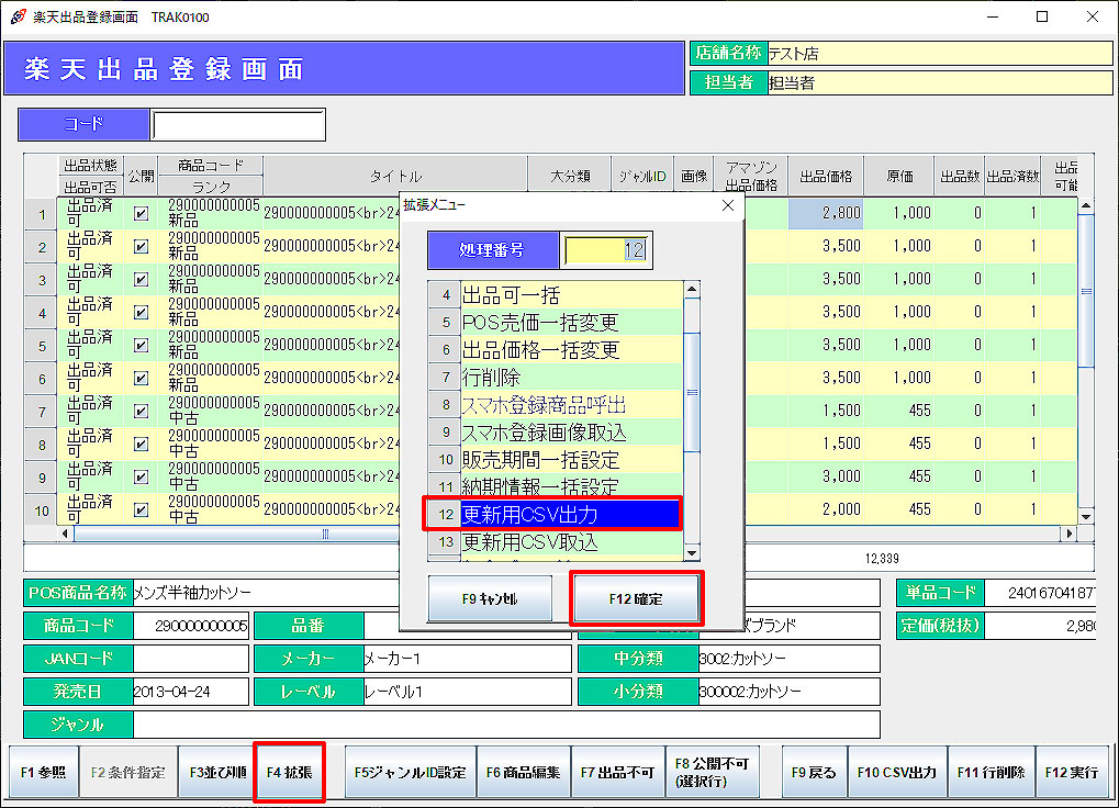 「F4拡張」メニューより「更新用CSV出力」を選択し、「F12確定」をクリックします。