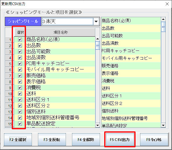 該当する項目の「選択」にチェックを入れるか、「F2全選択」で全項目選択し、「F5CSV出力」をクリックします。