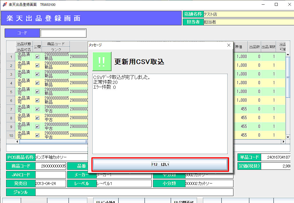 「F12はい」:再度CSV取込確認メッセージが表示され、「F12はい」で取込処理を行います。
