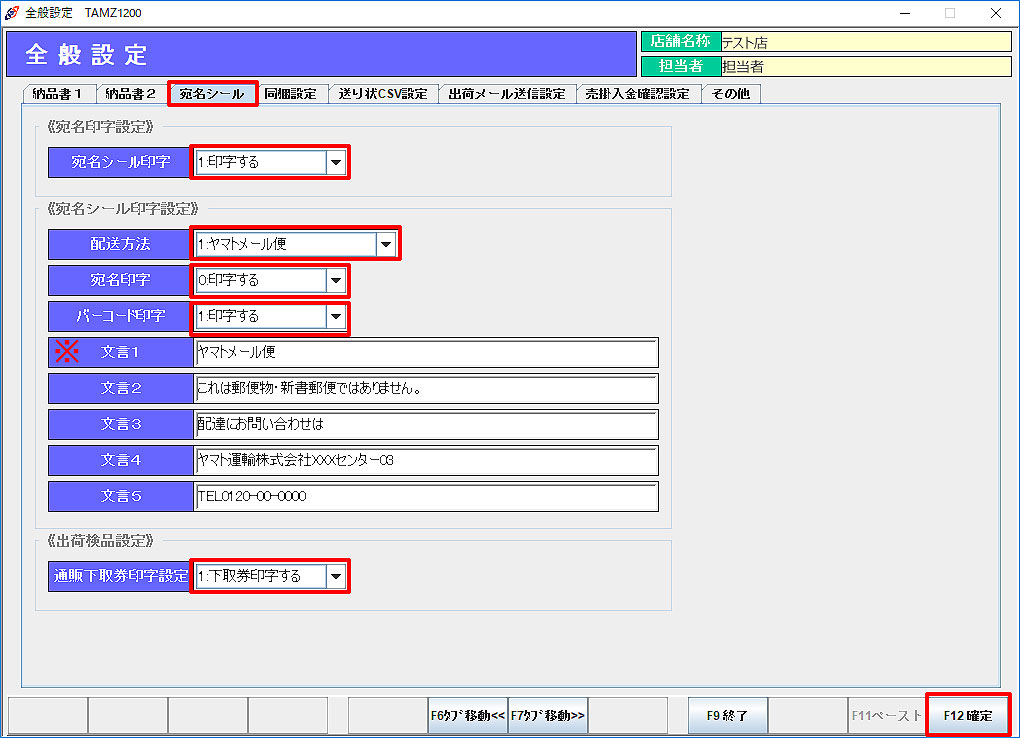 宛名シール:配送方法毎に宛名シールに印字する内容を設定します。
