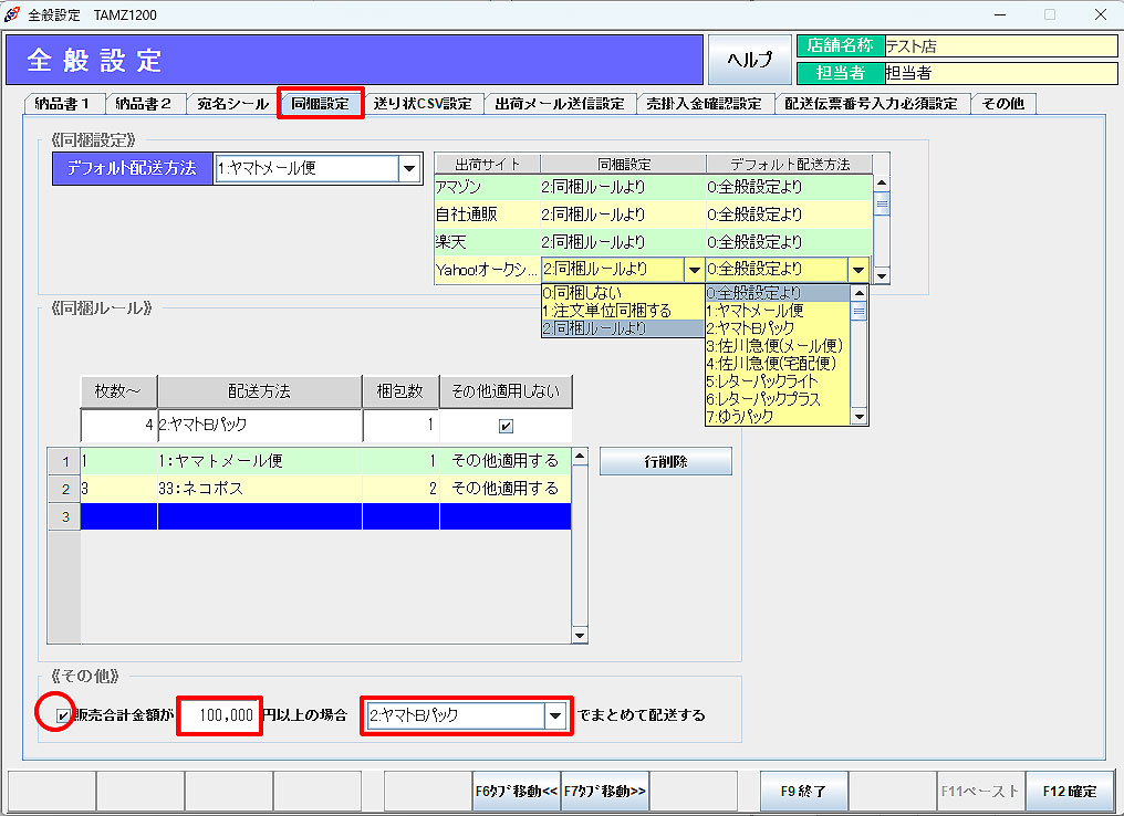 例)販売合計金額が100000円以上の場合、ヤマトBパックでまとめて配送する