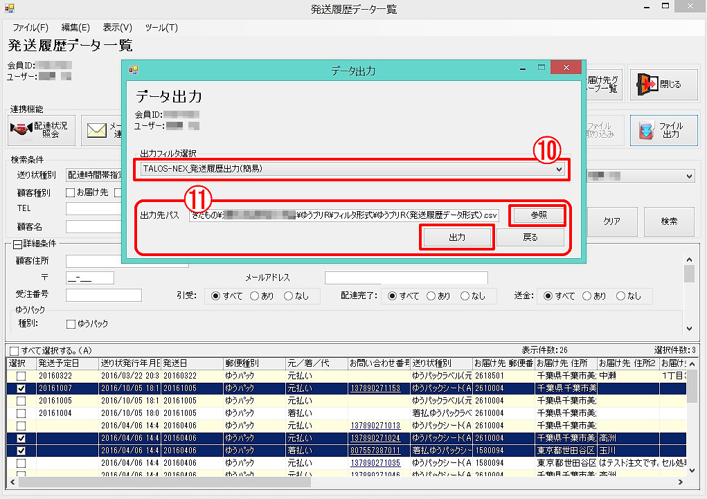 ⑩ データ出力画面で、フィルタ設定でダウンロードした「出力フィルタ(TALOS-NEX発送履歴出力)」を選択します。