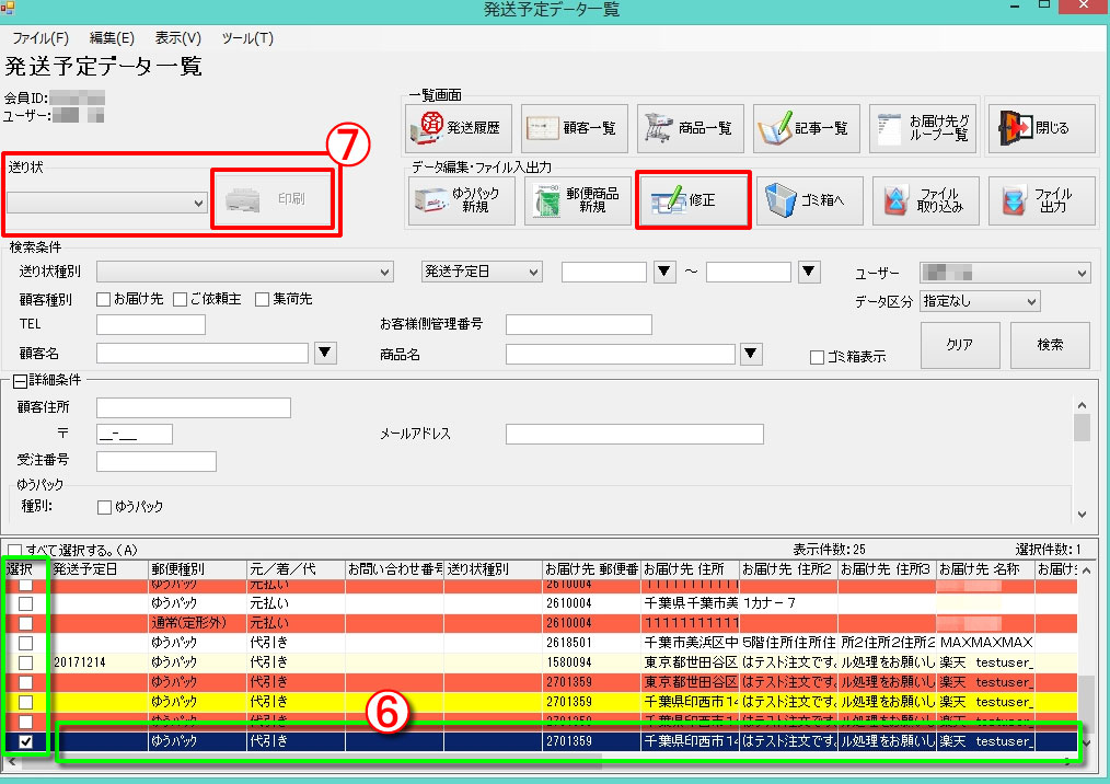 ※ 発送予定データ一覧の背景色が「赤色」のデータは、送り状印刷で必要な項目に不備があるデータです。