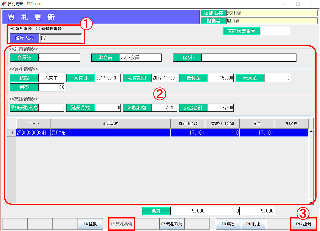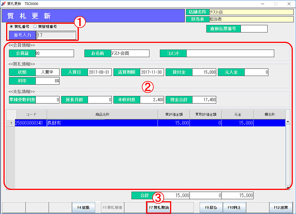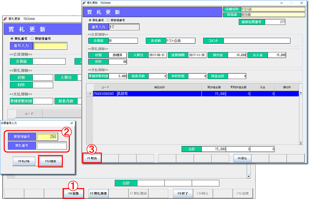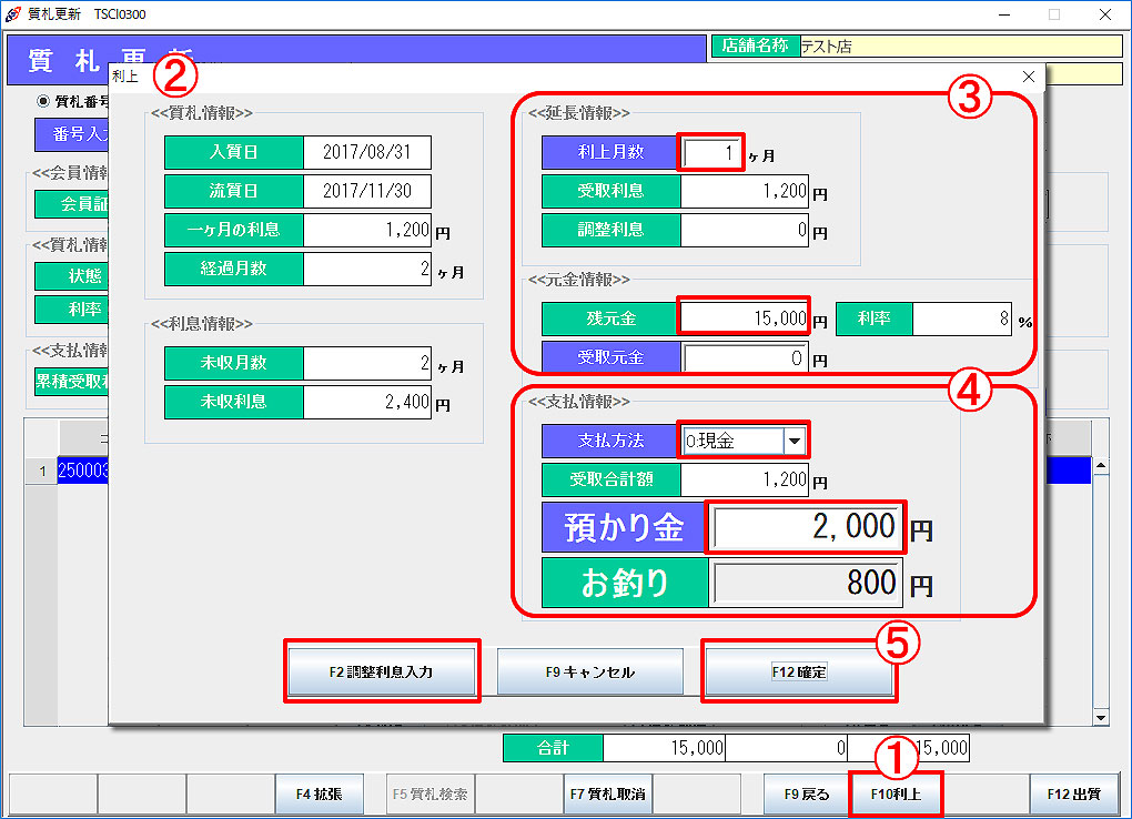 ※ 質札情報は、元金の一部を支払う場合や、流質期限を延長する場合などに「F10利上」より変更が可能です。