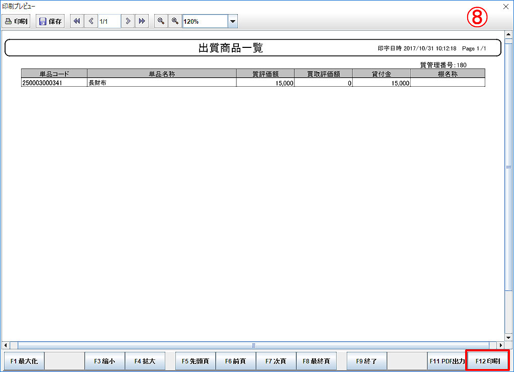「F12印刷」をクリックして、出質商品一覧を印刷します。