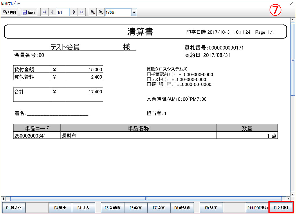 ⑦ 清算書印刷プレビューが表示されます。