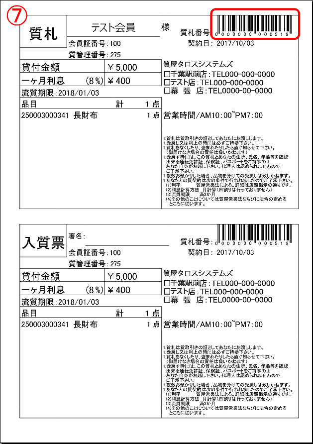 ※ 質札のバーコードは、出質時に必要ですのでお客様に保管していただきます。 入質票はお店の控えです。
