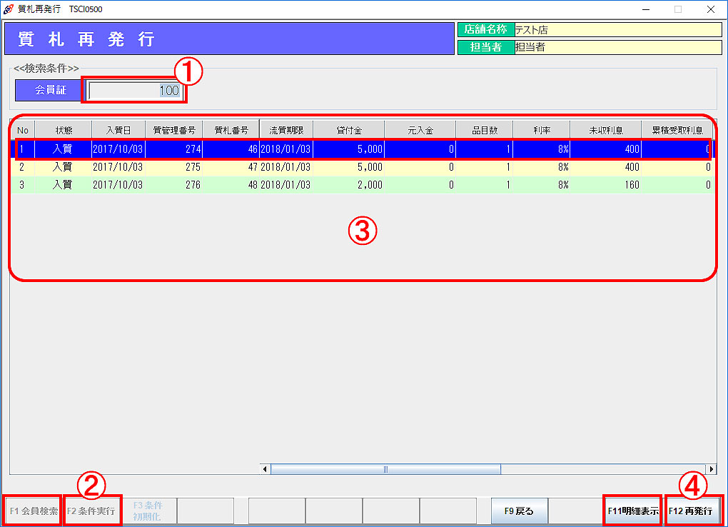 ③ 条件に当てはまる入質中の質札情報が表示されます。