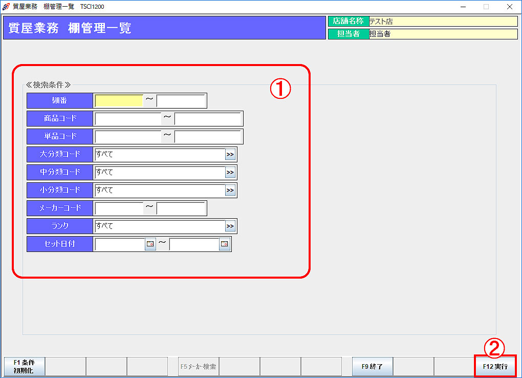 ① 検索条件を入力します。 条件を何も入力しなければ、棚にセットされている商品全てが抽出されます。 ② 「F12実行」で入力した条件に当てはまる棚管理商品が表示されます。