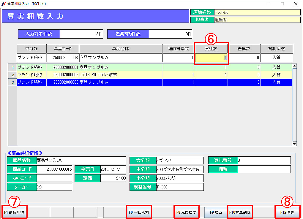 「F6一括入力」:選択行から下の実棚数を一括で入力します。