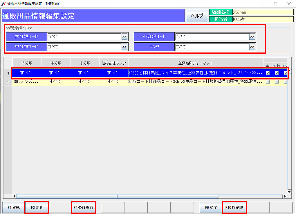 検索条件を指定(大・中・小分類、ランクの選択)し、「F4条件実行」をクリックします。登録済の名称生成フォーマットが抽出されるので、編集を行いたい名称生成フォーマットを選択し、「F2変更」より編集を行えます。
