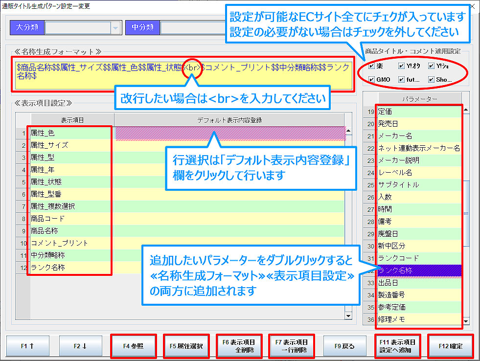 画面右側よりパラメーターを選択して「名称生成フォーマット」「表示項目設定」の登録を行います。