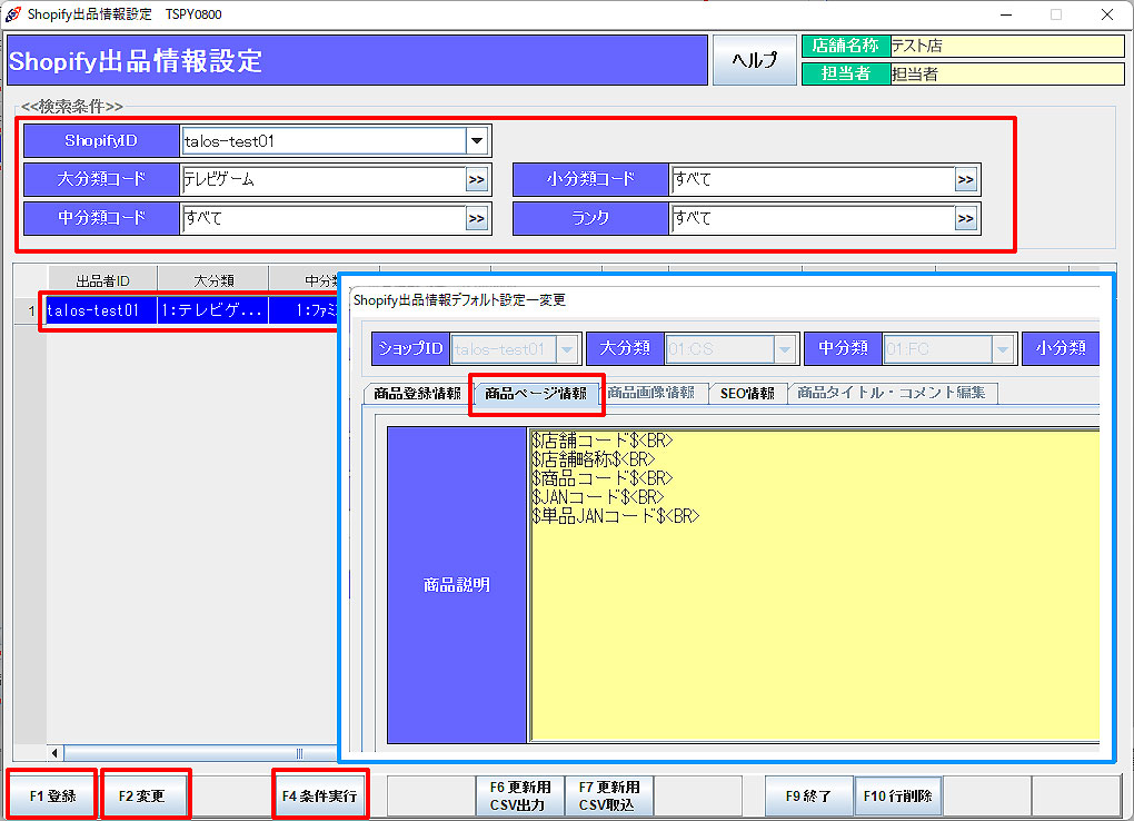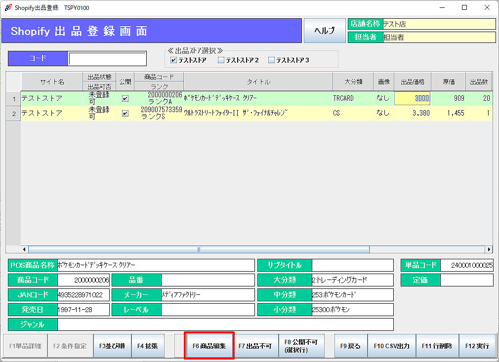 出品登録商品を呼び出し、「F6商品編集」より商品タイトル・コメントの編集を行います。