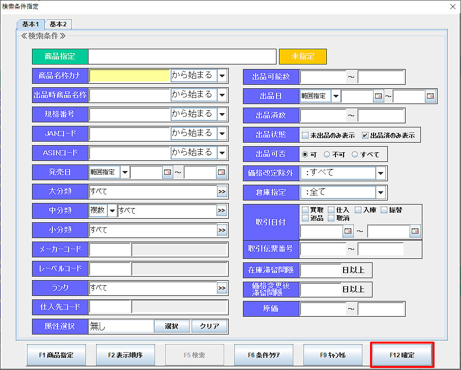 検索条件を入力し、「F12確定」をクリックします。