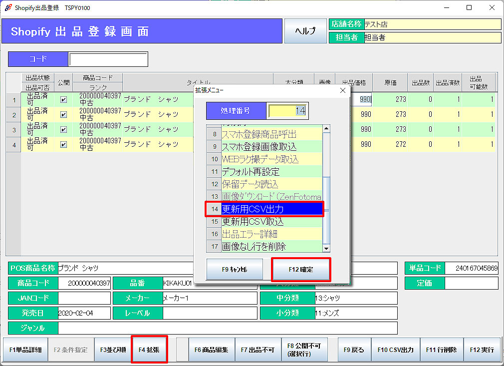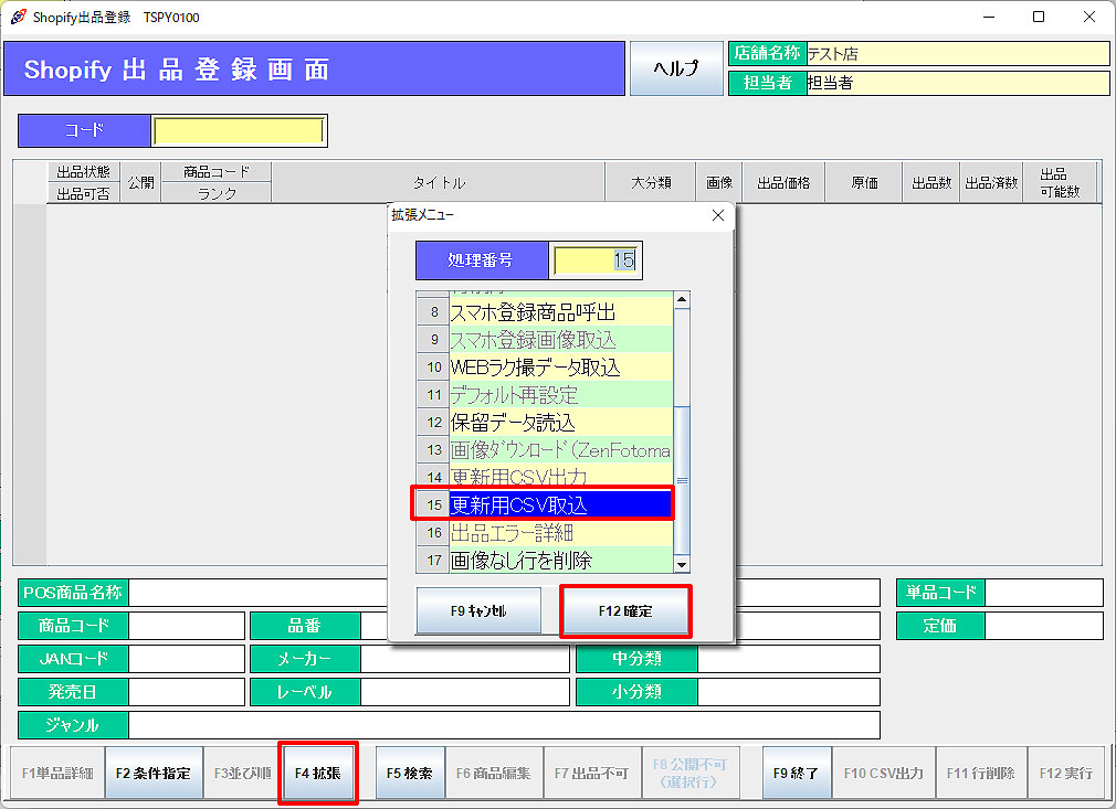 「F4拡張」メニューより「更新用CSV出力」を選択し、「F12確定」をクリックします。