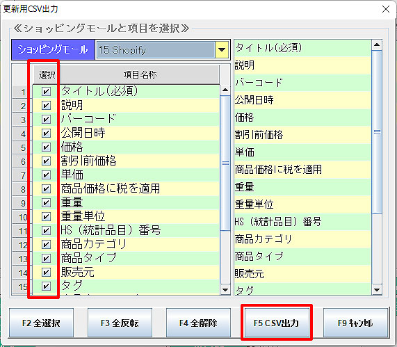 Shopify更新用CSV出力 4.CSVに出力する項目を選択する画面が表示されます。