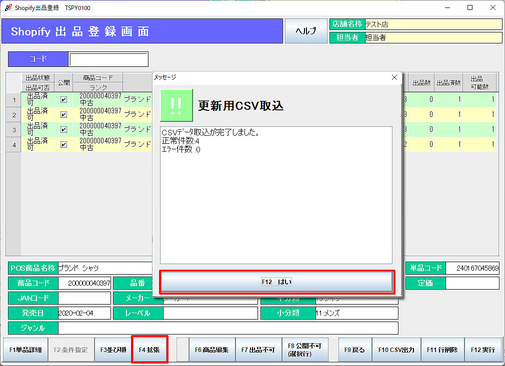 「F12はい」:再度CSV取込確認メッセージが表示され、「F12はい」で取込処理を行います。