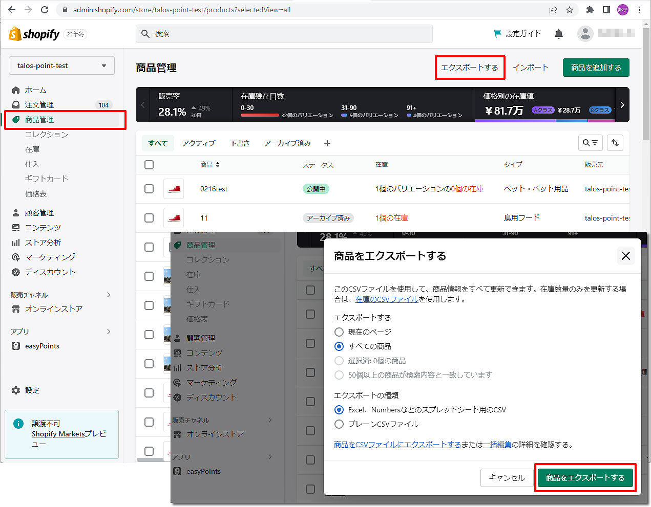 1.Shopify管理画面「商品管理」より商品をエクスポートします。