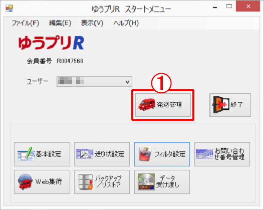 CSV連携設定 ① ゆうプリRを起動し、スタートメニューの「発送管理」ボタンを押します。