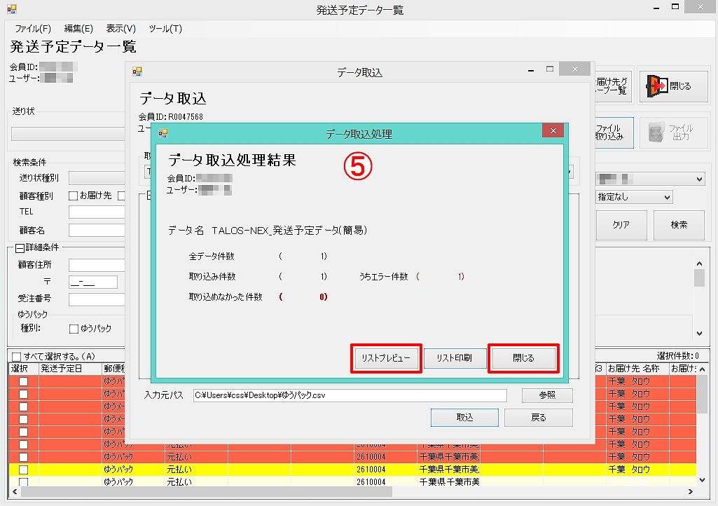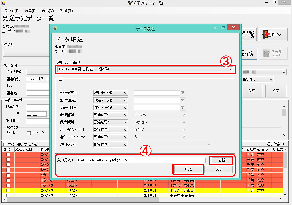 ④ 「参照」ボタンを押して、保存先よりタロスから出力した送り状CSVファイルを選択し、「取込」ボタンを押します。