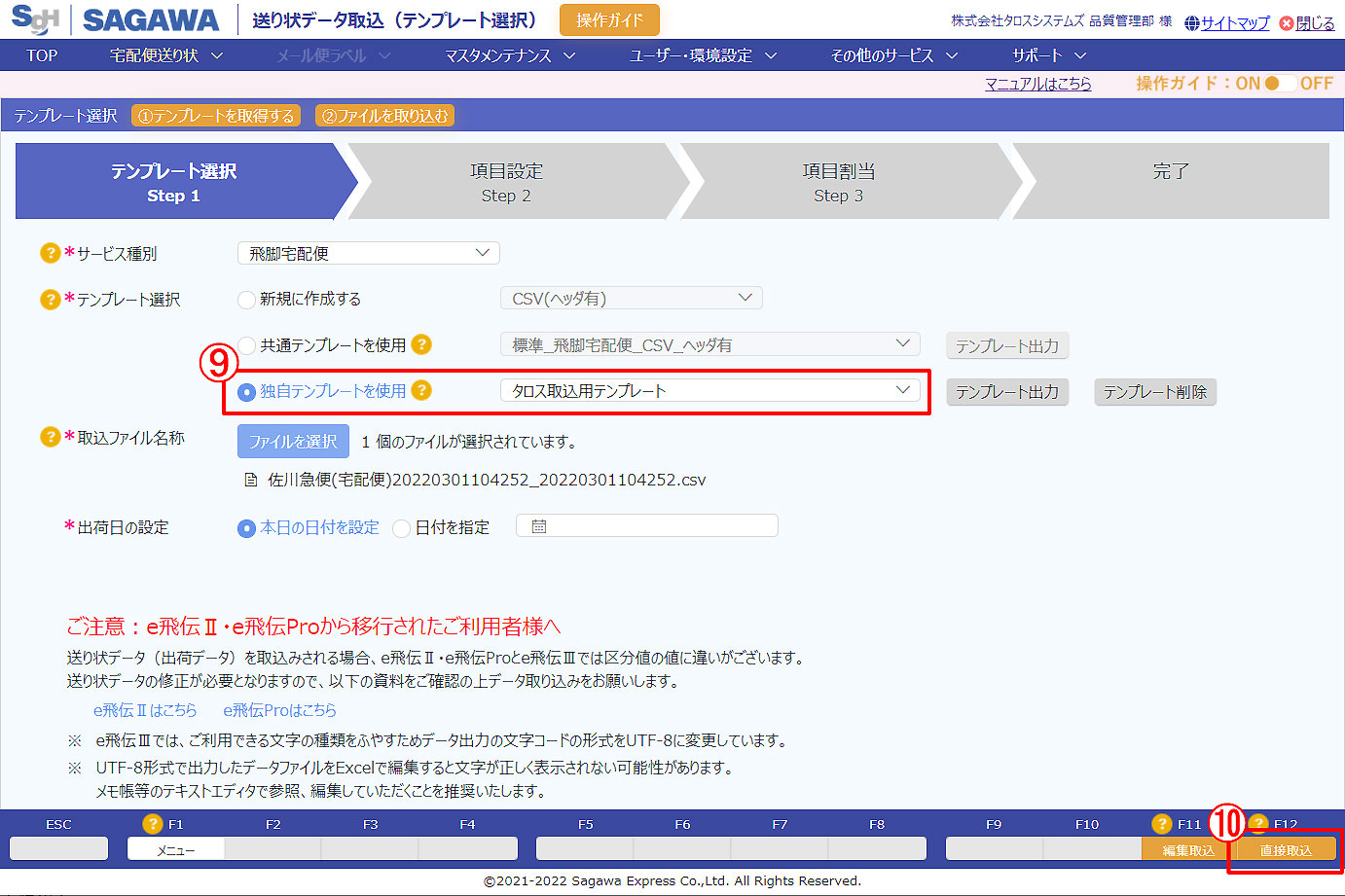 STEP2.タロスから出力した送り状CSVをe飛伝Ⅲに取り込む