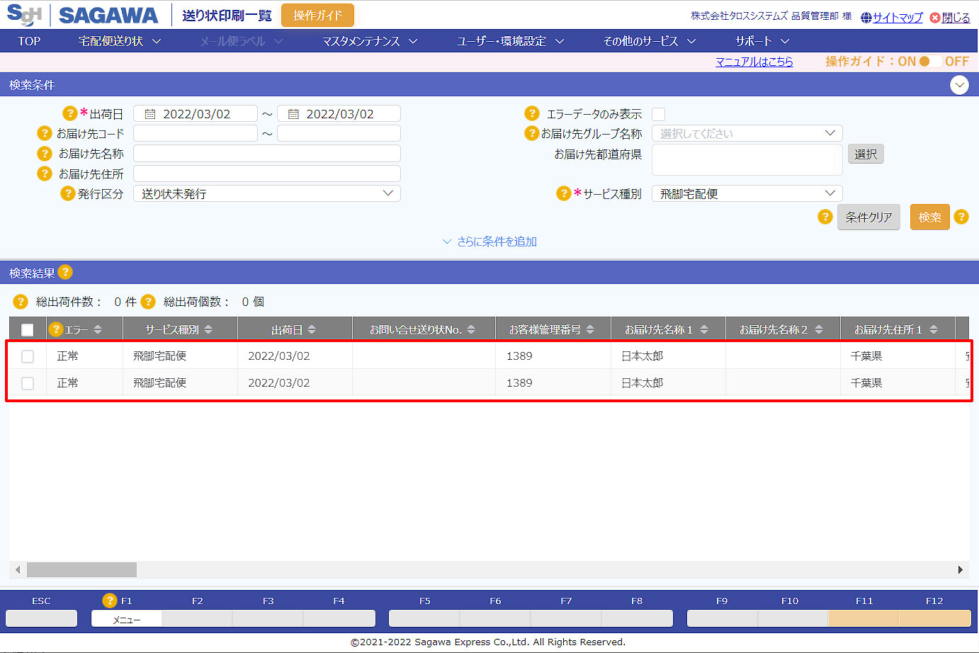 F12出力」をクリックして送り状CSVファイルを出力します。