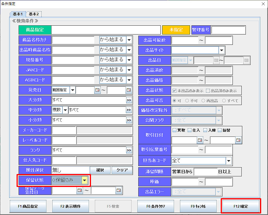 ※ 保留データの呼び出しは、「F2条件指定」より「保留状態:保留のみ」を選択、他条件を指定して抽出する方法や、 「F4拡張」より「保留データ読込」で現在保存されている保留データ全てを呼び出す方法もあります。