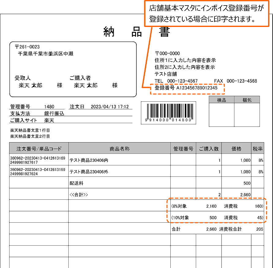 ※ インボイス用書類であるため、税率ごとに区分した消費税額を印字します。 「店舗基本マスタ(基本2)>軽減税率利用フラグ」が「利用しない」の場合でも税内訳を印字します。