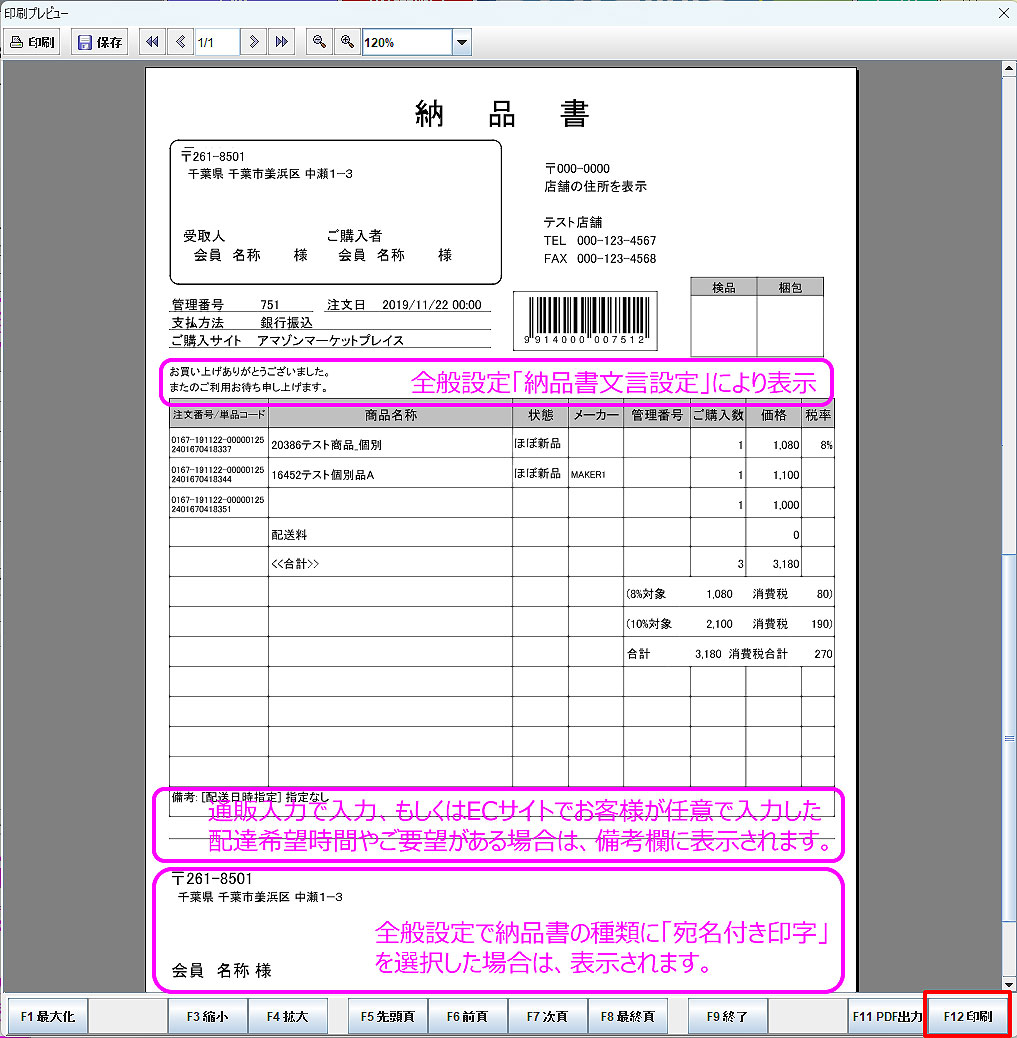 [納品書印刷イメージ 例)納品書種類:「宛名付き印字」]