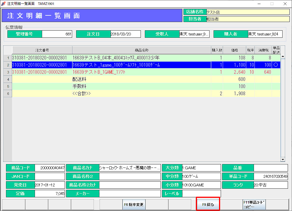 「F5明細表示」:選択行の明細を表示します。「F9戻る」で注文一覧に戻ります。(下記参照)