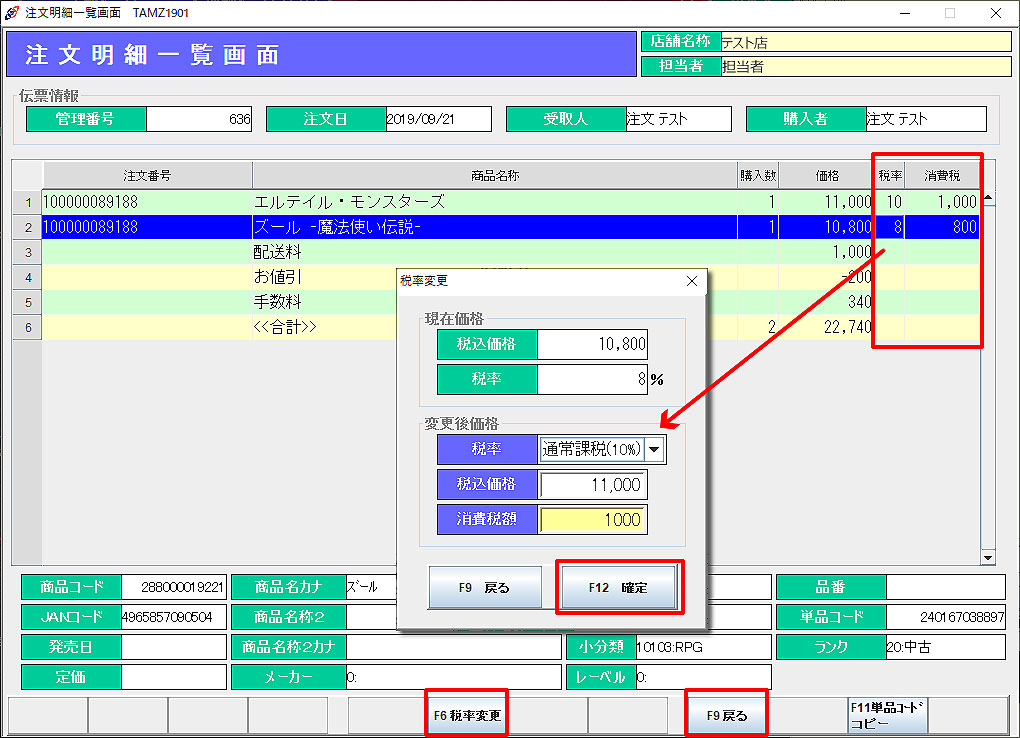 F6税率変更:選択行の税率変更・消費税額変更・販売価格変更が可能です。「F9戻る」で画面を一旦閉じて、開き直すことで合計金額に反映されます。