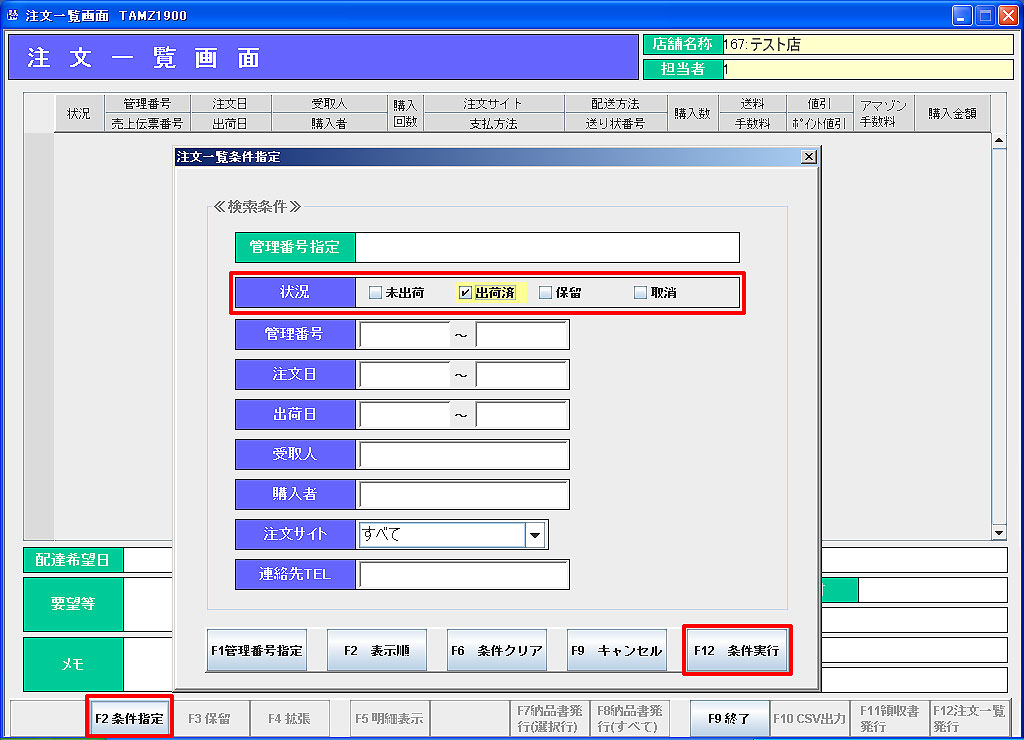 ③ 「状況」を選択し、その他検索条件を入力して「F12条件実行」をクリックします。 条件に当てはまる注文データが表示されます。