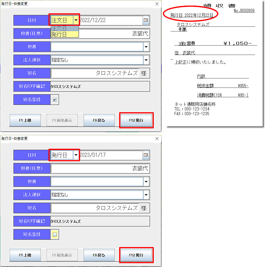 ※ どちらの日付で印字した場合も、領収証の表記は「発行日0000年00月00日」と表記されます。