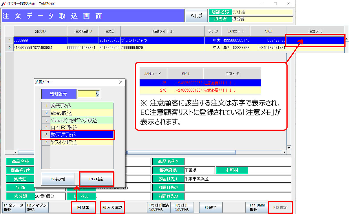 ※ 駿河屋設定(支払方法紐付け設定)で入金確認にチェックのある決済による注文は、注文データ取込以前に「入金確認処理」が必要です。 「F5入金確認」で入金データを呼び出し、入金確認を確定することで注文データの取込みが可能になります。 (駿河屋側の注文者チェック完了前の注文を入金確認済みにすることは出来ません)