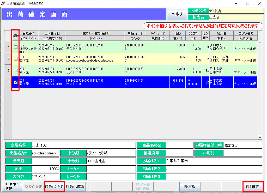 ※ 出荷商品の選択は伝票単位です。 出荷商品を選択すると、選択した商品が属する伝票内全ての商品にチェックが入ります。 「F3チェック全て」をクリックすると、表示された出荷可能商品全てが選択されます。