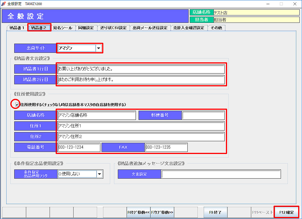 「住所使用する」にチェックを入れ、納品書に表示する自店舗情報を入力します。